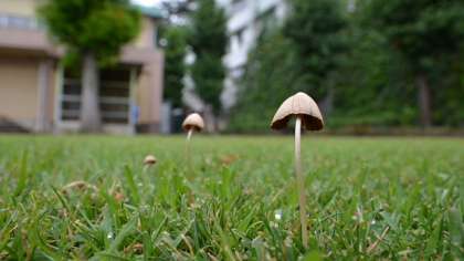 18日、今朝も芝生にキノコが生えていました。調べてみると「キコガサタケ」という種類のようです。芝生にとってはあまりよくない状態(水はけや、土中の空気の通りが悪い状態)のようです。管理業者さんと連絡をとって、対策を施したいと思います。