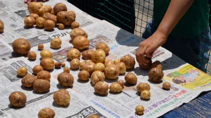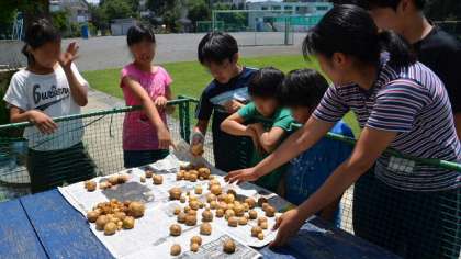 夏休みを前にして、植物の成長について調べるために植えていたジャガイモの収穫も行いました。大きさはまちまちでしたが、ジャガイモができていました。きれいに土を落とし、水洗いして干しているところです。