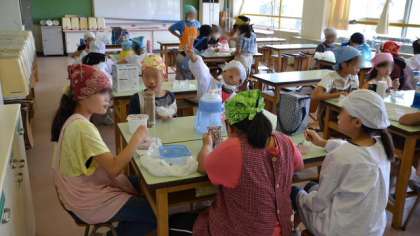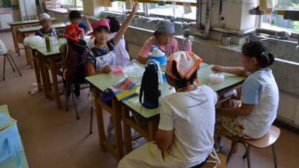 18日(木)、明日の終業式を前にして、5年生がお楽しみ会をしました。「かき氷パーティー」です。家から持ち寄ったかき氷製造器と市販の氷を使って、かき氷を作って食べました。昨日までとうって変わって暑くなった今日は、かき氷にはもってこいの日となって、子どもたちは満足そうに冷たいかき氷を食べていました。