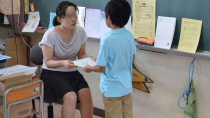 通知表には、担任からの子どもたちへの、心からのメッセージが込められています。それをしっかり受け止める子どもたちです。写真は4年と5年のようすです。