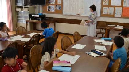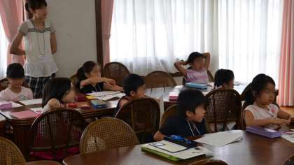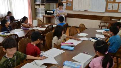 20日(土)は、1学期最後の寺子屋がありました。昨日が終業式で、今日から実質的な夏休みの初日。それでも勉強熱心な1〜3年生が登校してきました。写真はランチルーム、前半の一斉授業形式の1年生の学習のようすです。