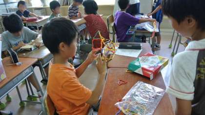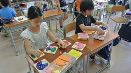プリント学習や、答えの直しが済むと、普段は算数教室に置いてある様々な算数の教具を使って、各自学習します。遊んでいるように見えますが、数の概念や図形について、教具を操作しているうちに身につける教材です。普段の授業では、このような教材を使うまとまった時間がとれないので、子どもたちが喜んで使っています。