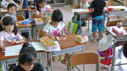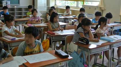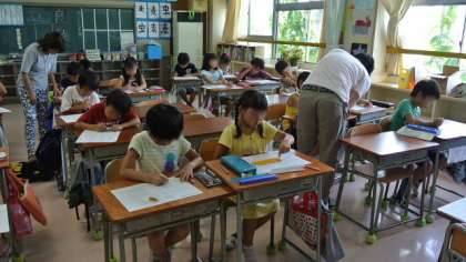写真は1・2年生のようすです。出席率は1・2年生が一番よいですね。夏休みの午前中を有意義にすごす子どもたち。普段あまり授業で会うことのない先生と学習できるのも、ちょっと新鮮な気持ちのようです。