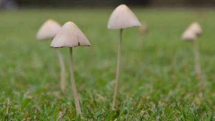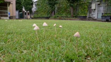24日の朝、芝生に点々と白いものがたくさん・・・。近づいてみると、先日もはえていたキノコです。それもたくさん。昨日の大雨のせいでしょうか?たっぷり水分を吸った芝生の間から、一晩でこんなにたくさんのキノコがはえてくるなんてビックリです。