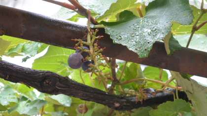 校長室前のブドウが、毎日夜か早朝に、何者かに食べられた形跡があります。たぶん鳥だと思うのですが、熟しておいしそうな粒の中身が食べられ、皮だけが地面に落ちています。今まではこんなことはなかったのですが。もう少したったら、水泳教室に来た子に、わけてやろうと思っていたのですが。