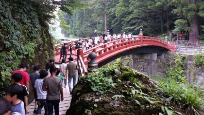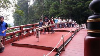バスはいよいよ日光の核心部へ。まず日光の入り口にかかる「神橋」の見学です。橋脚の無い赤い木製のアーチ型の橋をわたると、下には透き通った大谷川が流れています。