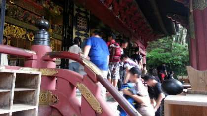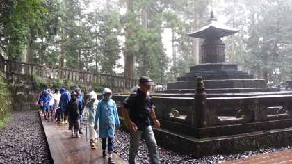 家康の墓に到着。登りの石段はさすがにきつかった!ところで何段ありましたか?昇ってきた石段を下り、本殿を見学しました。写真撮影は禁止ですので入り口の様子だけです。本殿に入った直後、雨が激しくなり、ラッキーでした。最後の見学場所「鳴き龍」に向かう頃には雨もやみました。これも中は撮影出来ませんので入り口のようすだけです。