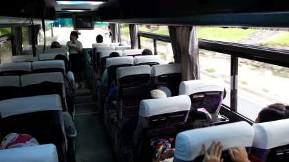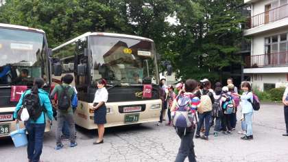 7時半、玄関前に集合してバスに乗り、奥日光へ出発です。バスは日光東照宮の前を通って、いろは坂へ向かいます。
