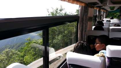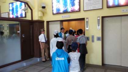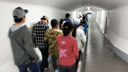華厳の滝に到着です。バスを降り、華厳の滝のエレベーターで観瀑台のある100メートル下までいきます。そこからトンネルを進むと観漠台です。初めて見る子も多く、ドキドキわくわくしながらトンネルを進んでいきます。