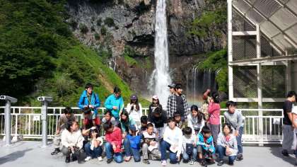 華厳の滝です。壮大な景色の前で子どもたちは感激です。記念写真を撮りました。