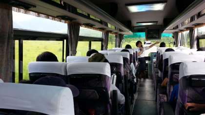 しばし華厳の滝に見とれた後、再びエレベーターで上がり、バスで奥日光湯本厳選をめざします。中禅寺湖班をバスは快適に進み、この後ハイキングをする戦場ヶ原や竜頭の滝、湯滝、湯の湖畔を通って行きます。寝不足でしょうか?眠そうな子もいますね。
