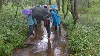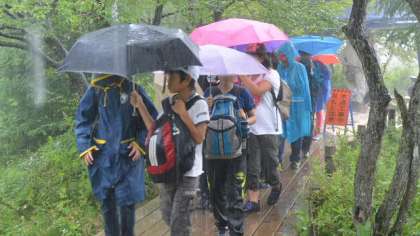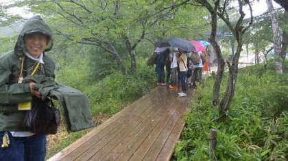 木道を歩いていると突然雨がふりだし、徐々に雨脚が激しくなってきます。土砂降りです。湿原地帯のまっただ中ですから、近くには雨宿りするような木がありません。予定を変更して近くの赤沼駐車場にバスを配車してもらい、雨具を身につけてひたすら歩くしかありません。しかしこの強い雨の中では、みんなびしょ濡れです。