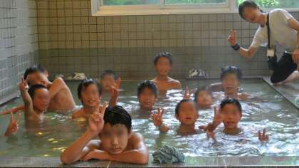 宿舎に帰ってきてすぐに、お風呂と、買い物をしました。今日は2組が最初にお風呂、1組がお土産の買い物をしました。2組男子の風呂場での記念写真です。雨で冷えた体が芯まで温まりました。