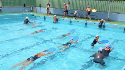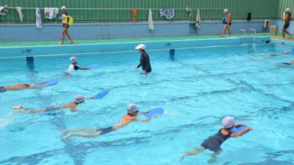 夏休み水泳教室、3・4年生のようすです。ビート板を使って、平泳ぎの足の動きの練習をしました。うまくできない子には指導員がていねいに教えていました。