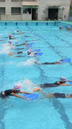 30日水泳教室、1・2年のようすです。ビート板を使ってバタ足の練習をしているところです。2年生はやはり上手ですね。1年生もすっかり水に慣れて、一生懸命練習しています。水の中でリラックスして浮かべるようになるのが水泳上達の第一歩です。