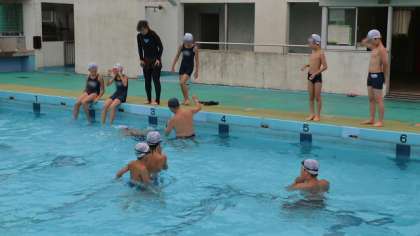 夏休みに入って10日余り。8月になりました。1日、今日は朝から小雨が降る天気でしたが、検定日でもあり、気温も水温も高く予報では土砂降りの心配もなかったので、水泳教室決行の判断をしました。小雨の降る中、やってきた元気な5・6年生ですが、さすがに人数は少なく、ちょっと寂しい感じがしました。でもその分、密度の濃い練習ができました。何度もタイムを計測したり、担当の教員や指導員から、ターンの仕方や泳ぎ方を丁寧に教えてもらうことができて、得したのではないでしょうか。