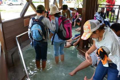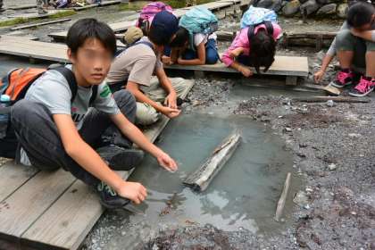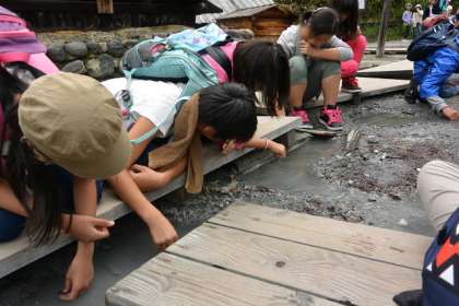 壮大な華厳の滝に感動した後は、バスで日光湯元温泉に行きました。最初に足湯を体験。ところがお湯が熱くて、ゆっくりというわけにはいきませんでしたが、みんな楽しいひとときをすごしました。その後地面からわき出している源泉に行き、持参したコインをお湯につけてみました。するとコインの表面がどんどん変色していきます。みんな興味津々でした。
