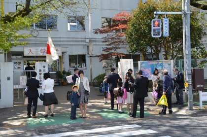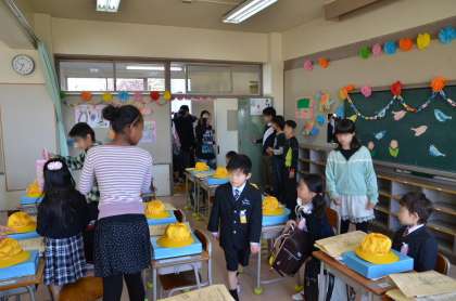 始業式が終わってすぐに入学式です。今年度は61名、2クラスの新入生を迎えました。6年生が出迎え、受付を案内したり、教室で式が始まるまでお世話をしました。新入生もどきどきですが、それを迎える6年生も、ちょっと緊張している雰囲気がありましたね。一生懸命によくはたらく6年生です。