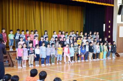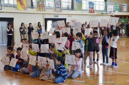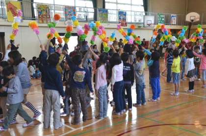続いては、4月13日に体育館で行われた「1年生を迎える会」のようすです。花のアーチをくぐって1年生が入場。舞台前にならんだ1年生に、各学年からメッセージとちょっとした出し物をしました。下の写真は2年生です。