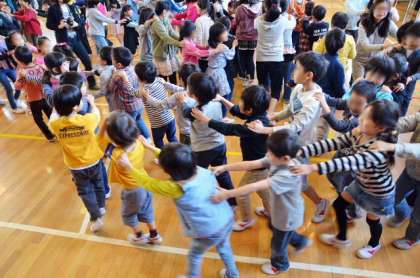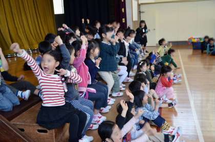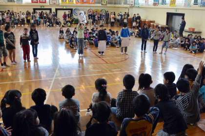 各学年の出し物のトリは6年生。クイズを出してもらって1年生もノリノリです。出し物の後は、全校児童一緒に「じゃんけん列車」のゲームで楽しみました。