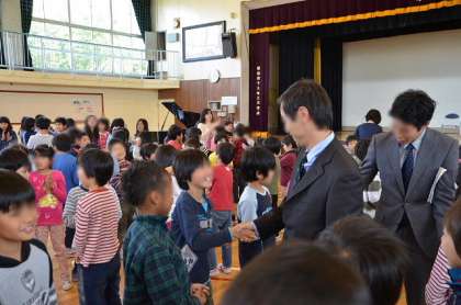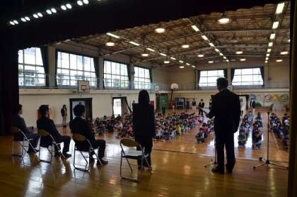 4月26日には、退職、他校へ異動した職員を招いて、離任式を行いました。子どもたちは、ちょっと寂しい気持ちと、久しぶりに会えたうれしさが混じり合った雰囲気でした。どの子も素直に感謝とお別れの気持ちを表していました。