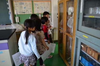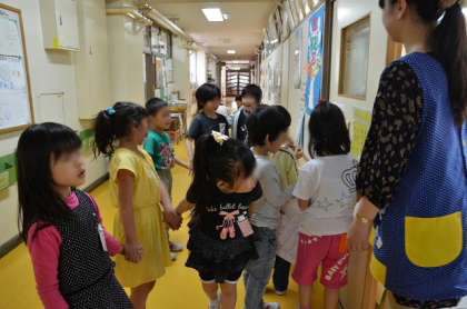 学年を超えた取り組みも今年度の目標です。写真は、2年生が1年生に校舎を案内する生活科の授業のようすです。2年生は先輩としての自覚をもってがんばりました。