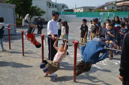 本校では年間の中に、重点的に体育的な動きを身につける取り組みを位置づけています。1学期に二は「鉄棒週間」を設定して、各学年に応じた技を身につけます。写真は「鉄棒週間」に先だって行った「鉄棒集会」のようすです。
