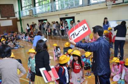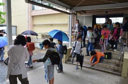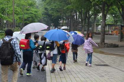 5月には集団下校の訓練もしました。震災など災害発生時には、保護者・家族の皆さんの引き取りがあるまで子どもたちは学校で待機させます。しかし、台風が近づいているときや近隣で事件が発生した時など、自宅まで送り届け、自宅待機で対応できるような時に、集団下校を行います。体育館に集合した子どもたちを、方面別にグループ分けして、自宅からできるだけ近いところまで職員が送り届けました。