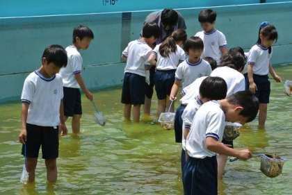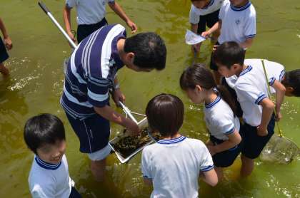 プール開きを前に、昨シーズンからたまりっぱなしだったプールの水を抜いて、業者によるプール清掃を行います。その前に、理科で昆虫について学んでいる3年生は、半年間プールに棲みついていたヤゴとりをしました。自然の池でもないのに、結構たくさんいました。見つけるたびに大きな歓声があがっていました。