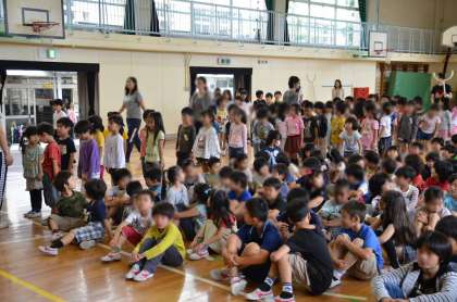 子どもたちの安全確保のために,様々な取り組みを行っています。写真は外部から不審者が侵入したことを想定した防犯訓練のようすです。地震や火災などの災害を想定した訓練も毎月行っています。