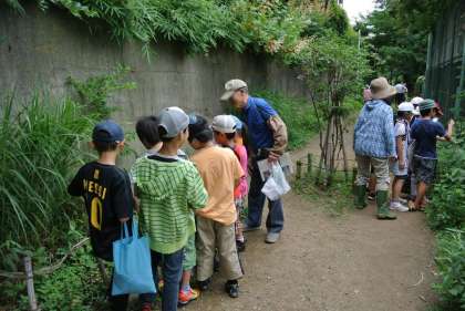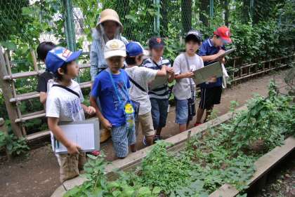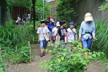 地域学習を進めている3年生。6月には「小径」に出かけて自然の学習をしました。「小径」は都立千歳丘高校の近くにある細い土の道です。「小径の会」の方々が植栽や手入れをして、身近な自然を守っています。この日は「小径の会」の皆さんに案内していただいて、世田谷の住宅地に残る自然にふれることができました。