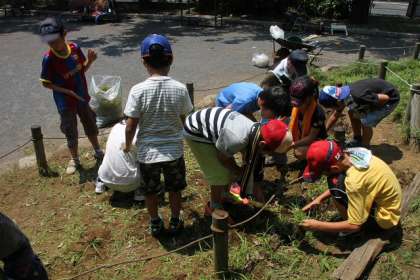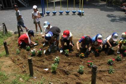 3年生の体験活動、「葭根公園の植栽管理」のようすです。3年生は1年間を通して地元での体験活動を1番多く設定しています。草取りをして、花を植える作業に、子どもたちは暑い中がんばりました。