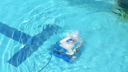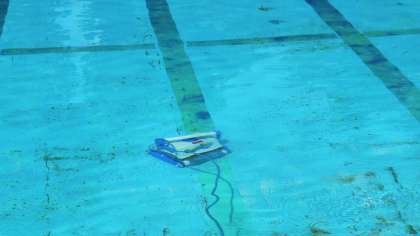 あさって21日から、夏の水泳教室後半が始まります。それに備えて、しばらく休業中だったプールの点検と、水質管理を始めました。例年似なく暑い夏のせいで、プールの底には沈殿物や藻がはえています。今日からプールロボットをフル稼働させて清掃作業をしています。