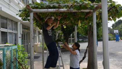 校長室前のブドウ棚、おいしいブドウがなっています。学校主事が収穫して、水泳に参加した子どもたちにわけました。