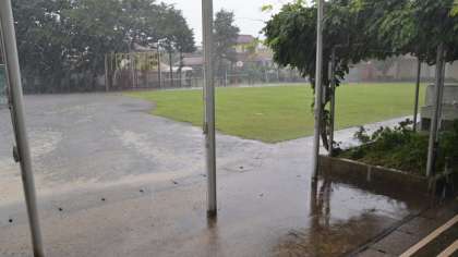 最近は「夕立」という言葉より「ゲリラ豪雨」と言うほうがポピュラーになりましたが、21日4時近くに雷がとどろき始め、その後写真のように大雨がふりました。ここのところあまり雨が降っていなかったので、木々にとっては恵みの雨となりました。校庭で練習していたサッカー部にとっては、練習中断となり残念な結果に。しばらく昇降口で雨宿りをして帰宅することになりました。