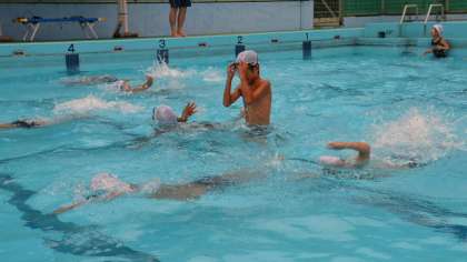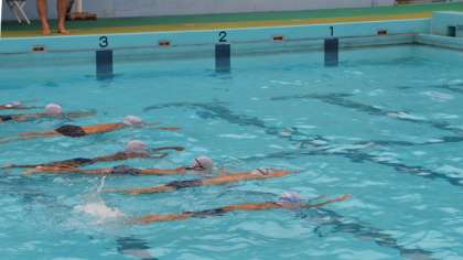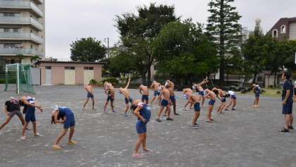 22日(木)、夏休み水泳教室後半の2日目を行いました。午前中はどんより曇り空でしたが、気温・水温ともに高く気持ちよく泳ぐことができました。写真は3・4年生のようすです。1回目の5・6年生が最後の確認やシャワーを浴びている最中に、校庭で準備運動をして、時間を有効に使います。今日も参加者は少なめで残念でしたが、さすがに参加したのはやる気満々。課題をしっかりこなして、どんどん上手になっていました。