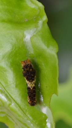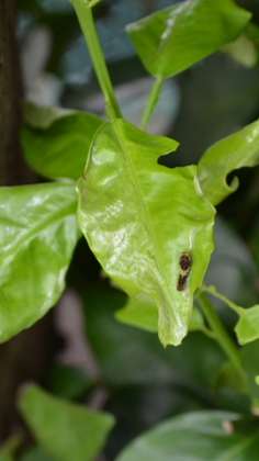 セミの抜け殻がたくさんあるプールの東側のユズの木の葉に、アゲハチョウの幼虫発見。まだ1齢です。この時期に孵化した幼虫は、サナギで冬を越すのですが、今年のように暑いとどうなるのでしょうか?