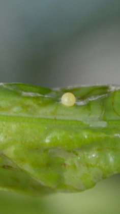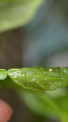 アゲハの幼虫のすぐ近くの葉には、真珠のような光沢の卵もくっついていました。いつ孵化するでしょうか?