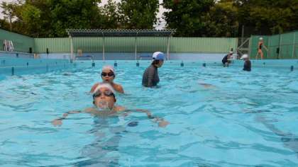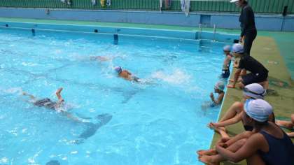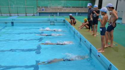 26日、夏休み水泳教室5・6年生のようすです。今日は気温が低かったせいか、20人ほどの参加でした。個人練習を主にやって、最後はみんなでリレーをしました。これがけっこう楽しくて、声援もとんでいました。夏休み水泳教室は木曜日まで行われます。