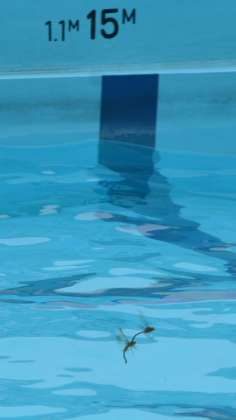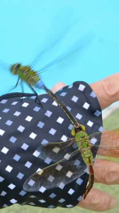 今の時期は、プールにトンボのつがいが現れ、盛んに水面に産卵行動をします。ほとんどがアキアカネなのですが、26日には、ギンヤンマのつがいが出現。たまたま指導員さんの腕にとまりました。写真を撮ろうとしたら飛び去ってしまったのですが、その一瞬をとらえることができました。上がオス、下がメスです。鮮やかな黄緑色が美しいですね。