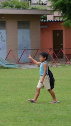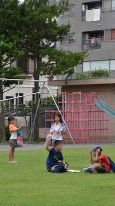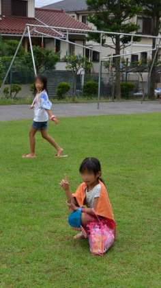 26日、芝生の上をアキアカネが飛び回っていました。プール帰りの子どもたちも関心をもって、指を立てて止まらせようとしましたが、なぜかとまろうとはしません。ひたすら飛び回っているので写真に撮ってもうまく写りませんでしたが、子どもたちの楽しそうなショットが撮れました。さまざまな自然の現象に関心をもてる子どもって、いいですね。