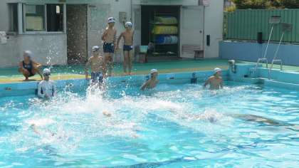 29日、夏休み水泳教室も最終日となりました。今日も晴れ渡った空の下、子どもたちが元気に水しぶきを上げていました。写真は5・6年生のようすです。前半と比べると、後半は5・6年生の参加は少なめでした。ちょっと残念です。2学期早々に5・6年生は水泳記録会を行います。保護者の方もご覧になれますので、ご予定ください。水泳記録会は、9月6日(金)の午後、5・6校時です。