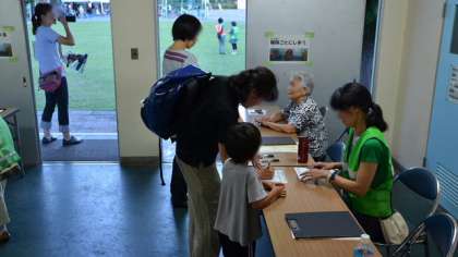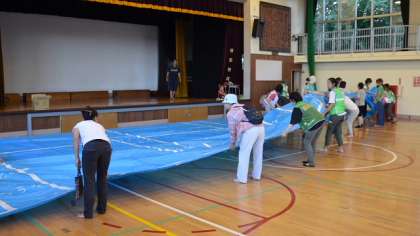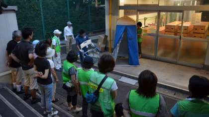 5時には避難所宿泊体験訓練もスタート。だんだんと薄暗くなる中で、受付や体育館の避難所設営、マンホールトイレ設営などの訓練を、一般参加者の皆さんも一緒に行いました。