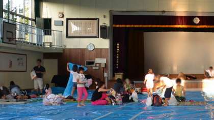一夜明けて9月1日、6時頃に皆さん起き出しました。初めての体育館での宿泊、そして高い気温で寝付けなかった方もいらっしゃったようです。それでもてきぱきと片付けを協力して行い、ラジオ体操をしました。