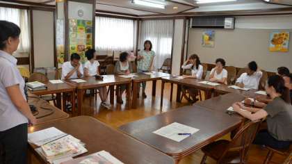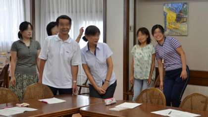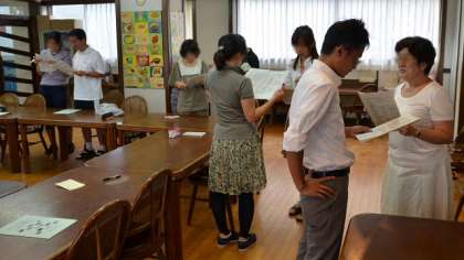4日(水)放課後、教員の英語研修を行いました。現在、5・6年生で週1時間の「外国語活動」(実質的には「英語活動」)の時間をとっています。これは、コミュニケーション能力の育成の一環として、外国語(英語)に親しみ、外国語に対する抵抗感を減らそうというねらいがあります。従来はなかった科目ですので、教員も毎年研修を重ね、子どもたちが楽しく学習できるようがんばっています。楽しさを伝えるためには、指導者が楽しくできなければなりません。研修は終始和やかな雰囲気で進みました。