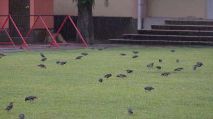 雨上がりの芝生に、大挙して飛来したムクドリの群れです。前回お知らせしたときよりも数が増えています。さかんに芝生に口を突っ込んで何か食べています。資料を調べてみると、芝生の中に潜んでいる虫を食べているということなのですが・・・証拠がつかめません。学校の芝生には、除草剤などの薬剤は一切まいていませんから、小さな虫がいるであろうことは想像できますが・・・?!