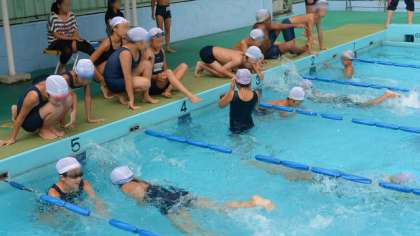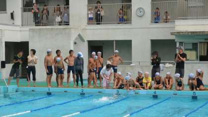 リレーでは、互いに励まし合って泳ぐ姿が見られました。また、本校の5年生は、男子が8名しかいないので、リレー25m×8人は、5年の男子が全員参加してチームを組みました。結果は4チーム中4位でしたが、その健闘にも惜しみない拍手が送られました。
