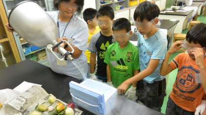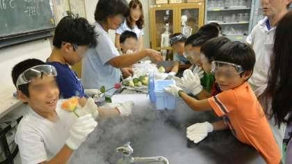 後半は、大気の主な成分である窒素が液化した液体窒素を使った実験です。家庭では絶対できない、マイナス196度の世界を身近に体験しました。ぶんか村活動は、青少年船橋地区委員会が主催して、船橋地区の希望丘小学校、船橋小学校、千歳台小学校、船橋希望中学校などの児童生徒が参加し、スポーツ以外のさまざまなジャンルの活動に取り組んでいます。地域の皆さんや協力してくださる様々な皆さんの力に支えられて、子どもたちが生き生きと活動している姿を見ると、うれしいですね。