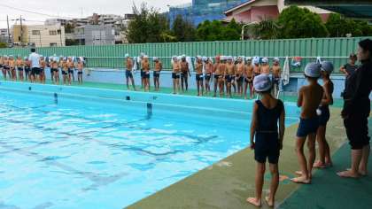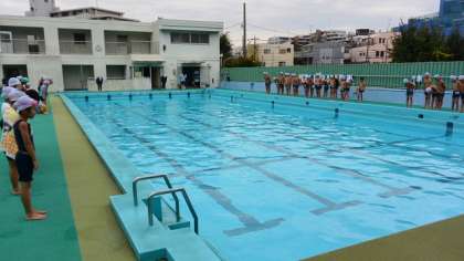 こちらは、3・4年生のプール納めのようすです。3・4時間目に行いました。今シーズンの水泳のまとめとして、3・4年生合同の3チームによる全員リレーをして、最後まで大接戦でした。明日11日、56年生がプール納めを行い、今シーズンの水泳指導は最後となります。