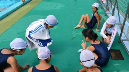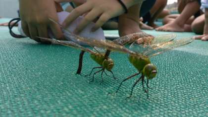 12日、5・6年生が泳力検定をしているところに、ギンヤンマのつがいが迷い込んできました。前が雄で、後ろが雌です。産卵行動をしていて、人が近づいても逃げません。おかげで近くにいた子どもたちが、たっぷり観察することができました。美しいライトグリーンとライトブルーが鮮やかです。